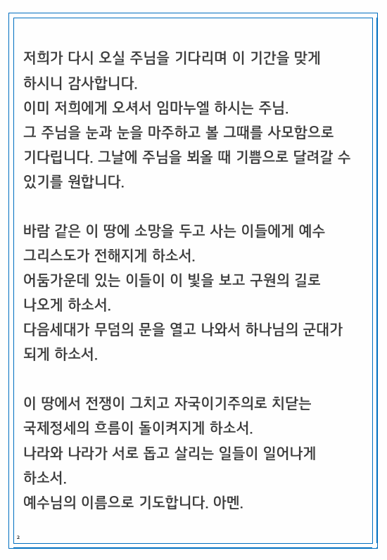 이곳은 말씀 기도한 내용이나 열방이나 북한, 우리나라를 위해 기도한 내용을 올리는 곳입니다.